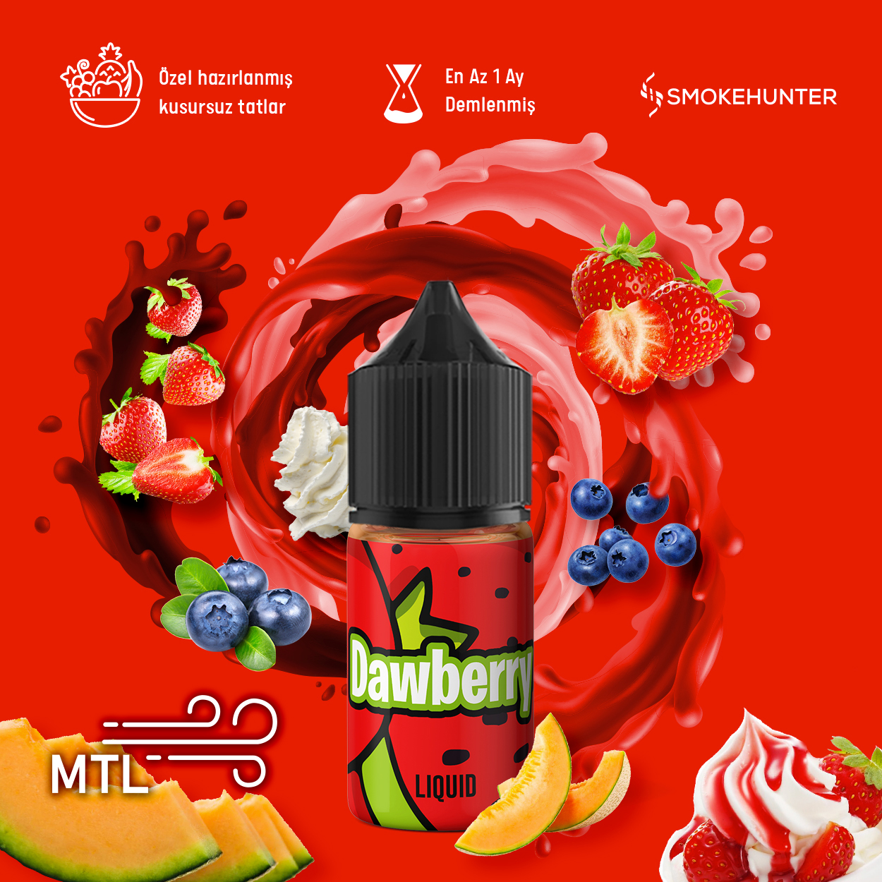 – Smoke Hunters grubunun Çilek, Tatlı Kavun, Çeşitli Kremalar ve Hafif Yaban Mersini tadıyla Dewberry artık sizlerle. 50-50 MTL Versiyonudur.